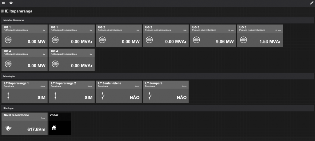 O último item na hierarquia hidráulica do aplicativo é a supervisão de cada uma das 17 hidrelétricas dos complexos. Através destas telas, é possível monitorar as potências ativa e reativa geradas por cada gerador das usinas, o estado dos disjuntores alimentadores e o nível do reservatório que supre as turbinas hidráulicas.